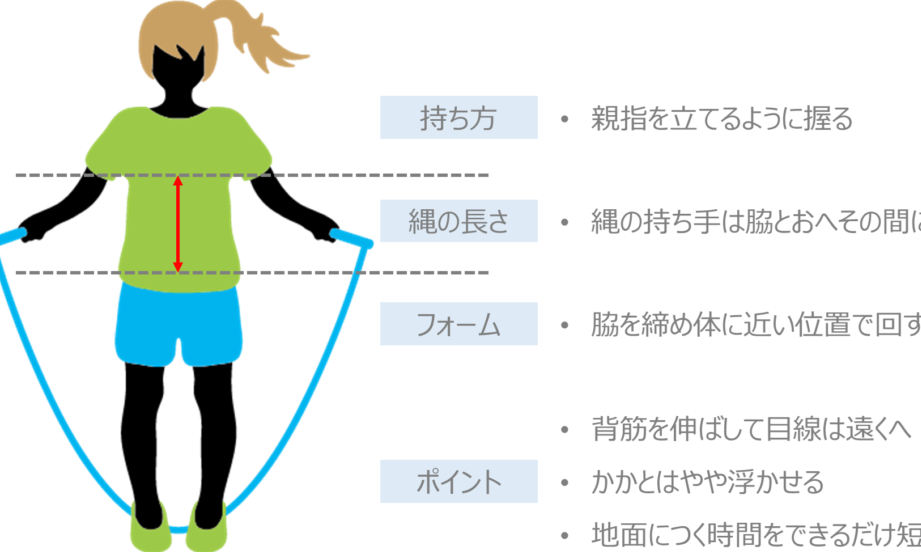 縄跳びを行う際は、正しいフォームが重要です。まず、足を肩幅に開き、つま先は前方を向けます。次に、縄を持つ手は肩の高さに保ちながら、肘を体の近くに固定します。そして、跳ぶ際は、つま先で軽く跳ぶことを心掛けて、膝を柔らかく保つことがポイントです。さらに、背筋を伸ばしたまま、視線は前方に向けることが重要です。