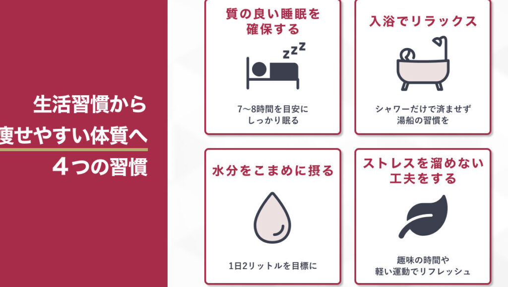 私たちが「何もせずに痩せたい」という願望を持つのは自然なことです。この夢を実現するためには、日常生活の小さな改善が鍵になります。睡眠や食事、ストレス管理を見直すことで、体は自然に脂肪を燃焼しやすくなります。