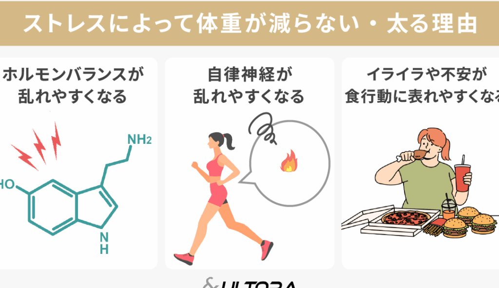 - ホルモンバランスの乱れ: ストレスはコルチゾールやアドレナリンの分泌を増加させ、代謝に影響を与える。