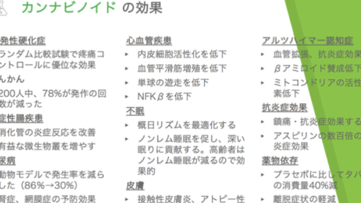 - カンナビノイドのバランスによって体重管理が可能になると言われている。特に、CBDの高い製品は過食を抑制する可能性がある。