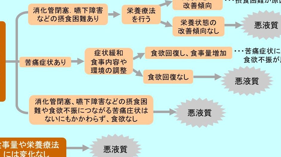 - 食欲低下: 悪性腫瘍による体内の変化や痛み、心理的ストレスが食欲を減退させることがあります。食事が取りにくくなると、栄養不足が進行します。
