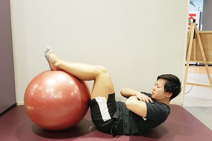 - 息を吐きながら上半身を少し持ち上げ、腹筋を収縮させます。