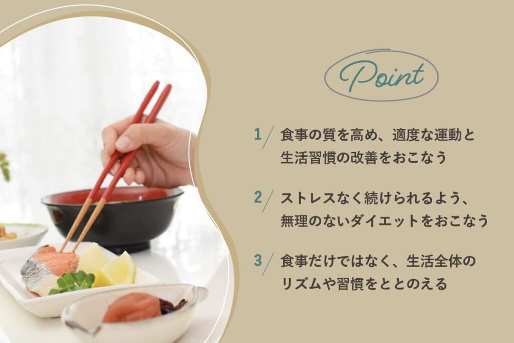 - 眠りの質を改善すること。十分な睡眠を確保することで、ホルモンバランスが整い、食欲のコントロールが可能になります。