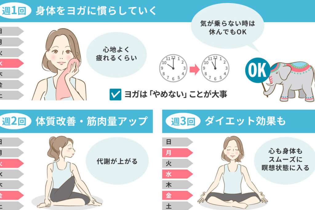 初心者の場合は、週に1〜2回から始めるのが良い。ヨガのポーズや呼吸法に慣れることが大切だからだ。以下のポイントを考慮しよう。