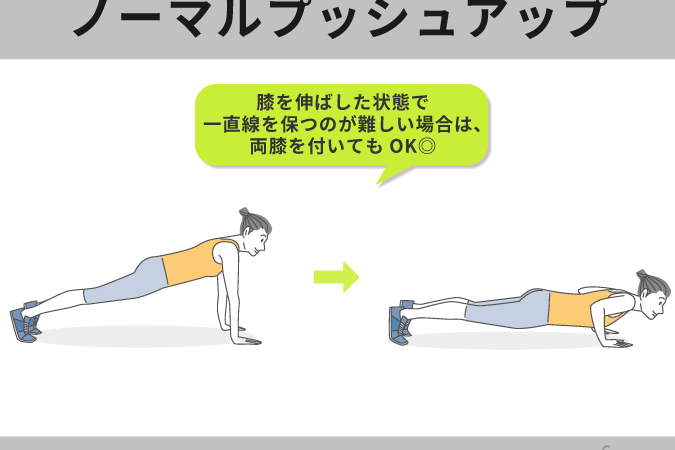 - プッシュアップ: 上腕三頭筋や胸筋を鍛えます。手の幅を広くして行うと、より三頭筋に効きます。