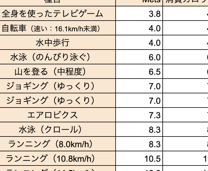 | 運動の種類 | 1時間あたりの消費カロリー |