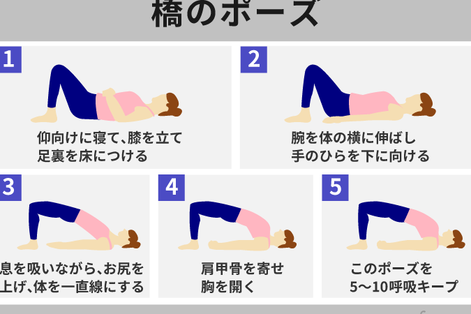 橋のポーズは、腰の筋力を向上させるだけでなく、背中や腹部の引き締めにも寄与します。