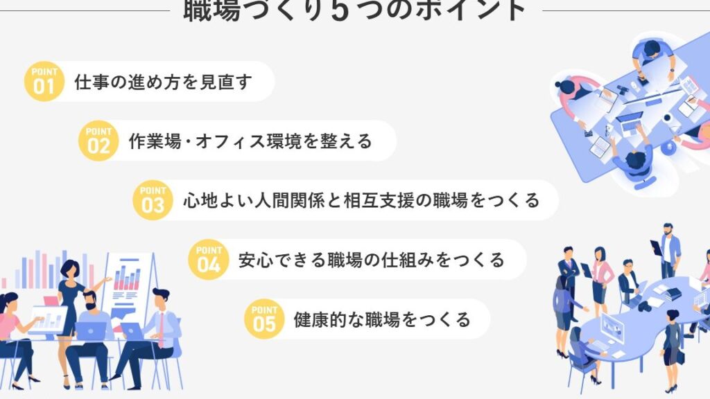 また、健康的な職場環境の整備も欠かせません。カフェテリアでは、栄養価の高い食事を提供し、社員が選びやすい環境を作ります。さらに、オフィス内での軽い運動を奨励し、例えば、エレベーターの使用を控え階段を使うことを提案します。