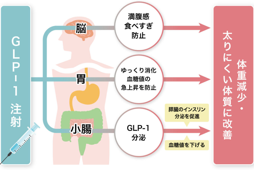 GLP-1受容体作動薬は、体内でGLP-1を模倣し、食欲抑制や満腹感の持続を促進します。具体的には、以下のような効果があります。