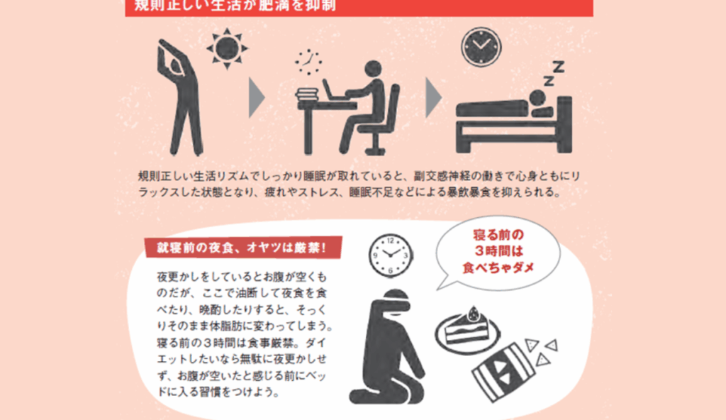 - 規則正しい睡眠は、満腹感を得やすくし、間食を減らす