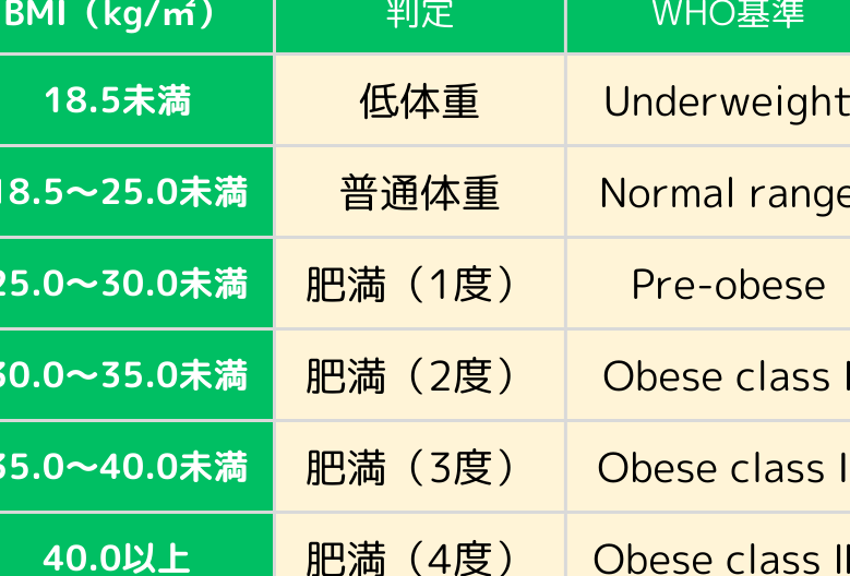 BMIによる分類は、体重管理において基本的な指標です。BMIの値に基づき、体重の状態を評価できます。以下の分類が定義されています。