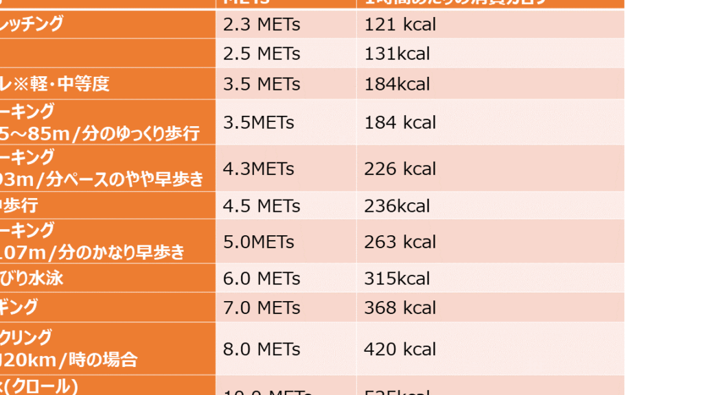 - レクリエーション: 1時間、軽いウォーキングをすると約300キロカロリー消費