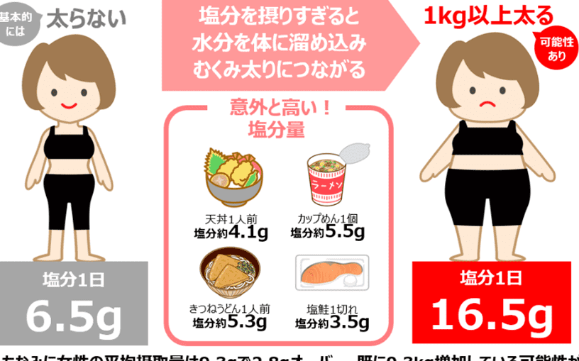 - 塩分の摂取を控える: 塩分の多い食事は水分の保持を助長します。1日の推奨塩分摂取量は6g以下です。