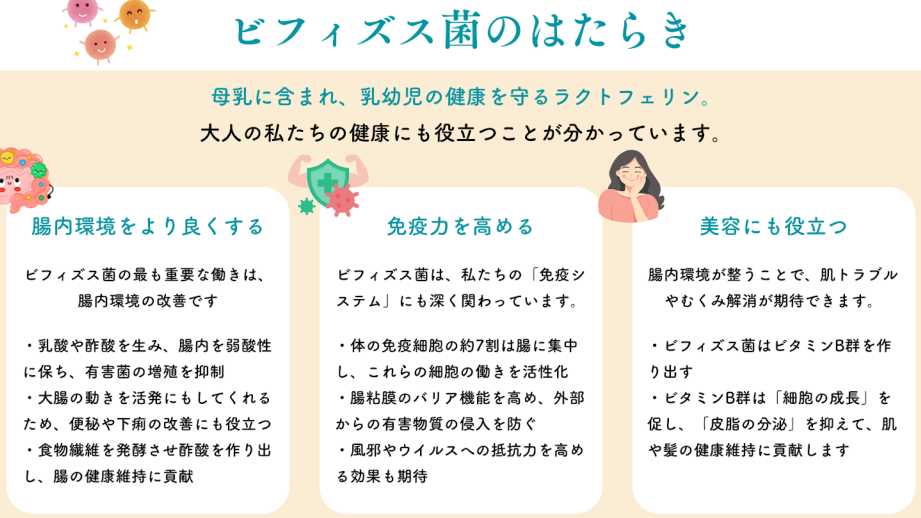 ビフィズス菌は腸内環境を改善することで知られています。具体的には以下のような点が挙げられます。