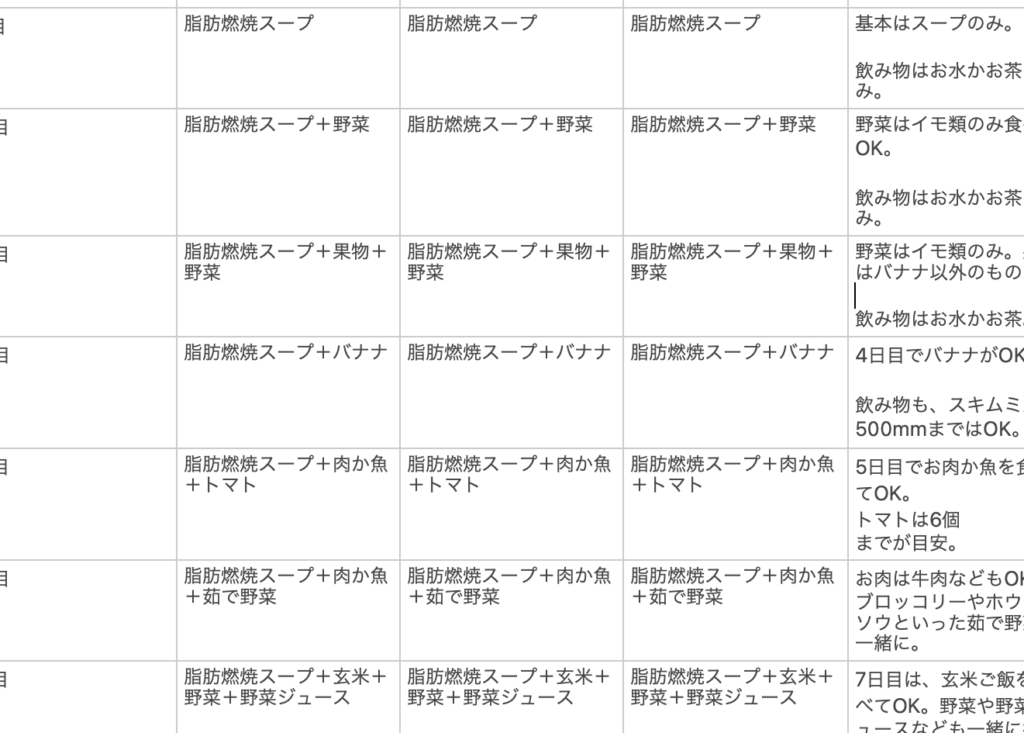 - 1日目: 脂肪燃焼スープと果物(バナナ以外)を中心とした食事