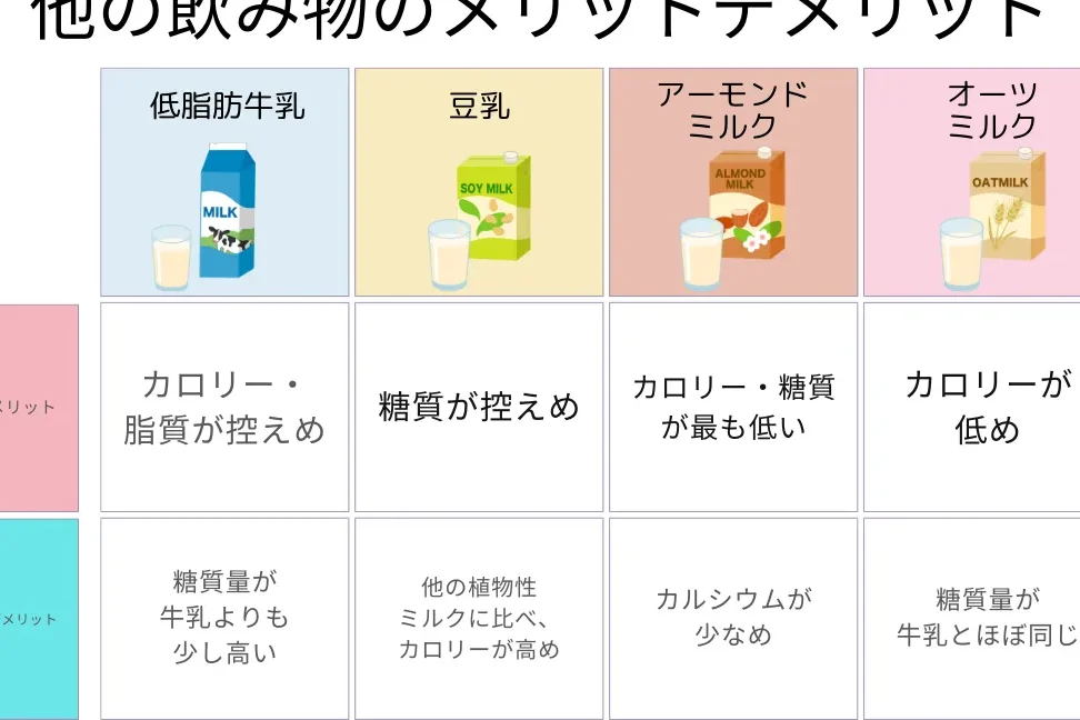 この表からわかるように、タンパク質や脂質量には差があります。 牛乳は一般的に高い脂肪含有量を持ちますが、一方で豆乳は植物由来であり、そのため健康志向な選択肢として人気があります。また、豆乳にはコレステロールが含まれていないため、心血管系への負担を軽減できる可能性があります。